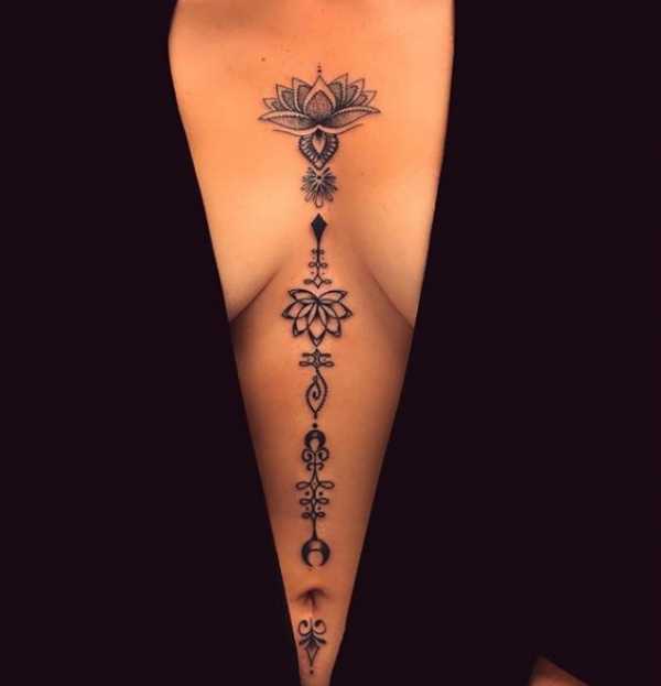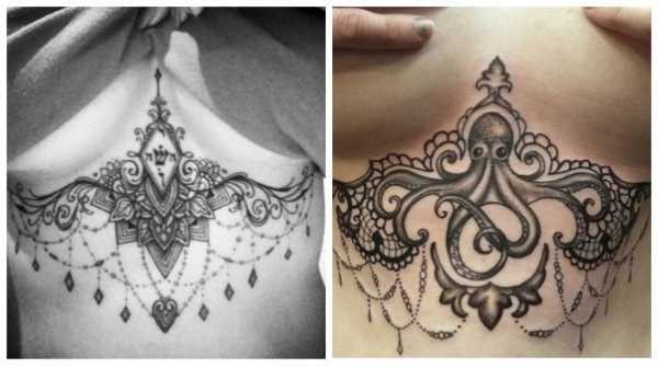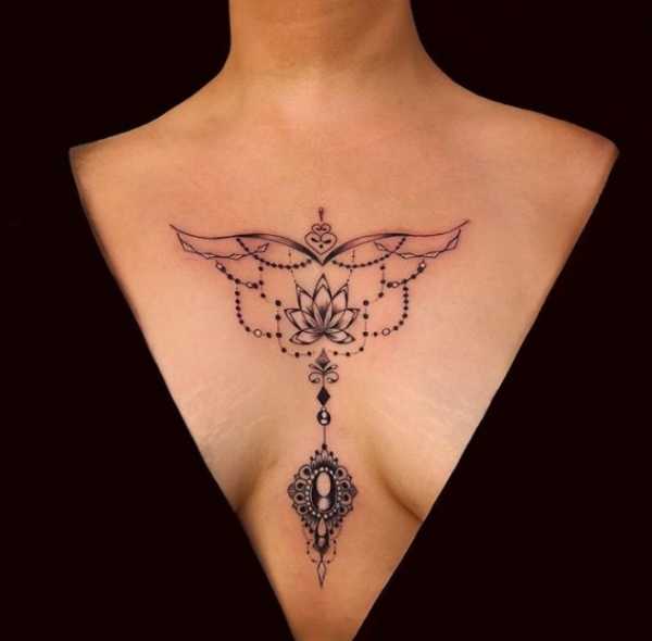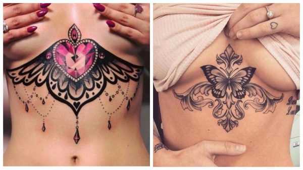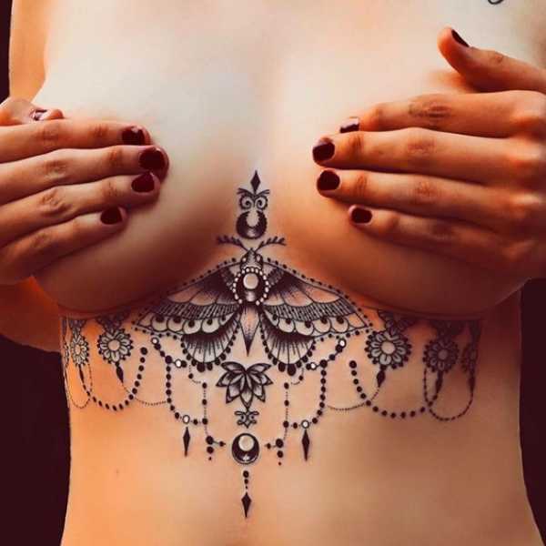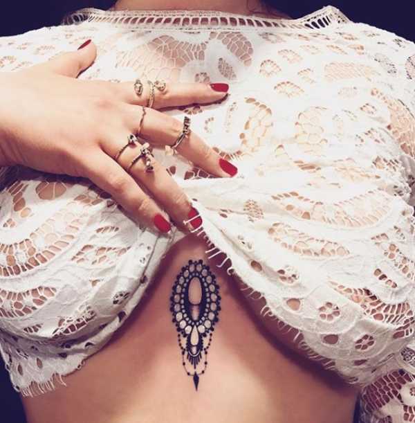 - Под грудью. Тату под грудью является трендом наступившего сезона. Чаще всего здесь можно встретить цветочные узоры и мандалы. О том, что это такое, мы поговорим чуть позже. А сейчас лишь заметим, что смотрятся эти узоры просто великолепно. Благодаря рисунку в этой части тела, девушка выглядит действительно сексуально, ведь он подчеркивает ее главное достоинство — грудь. Именно поэтому данное расположение считается на сегодняшний день топовым.