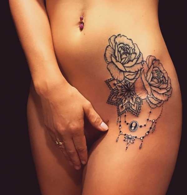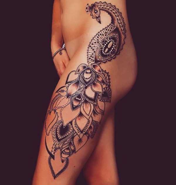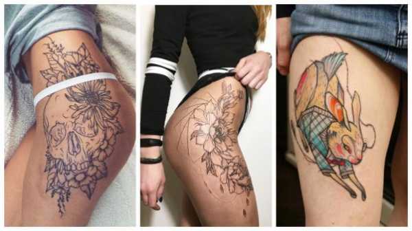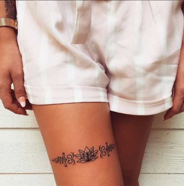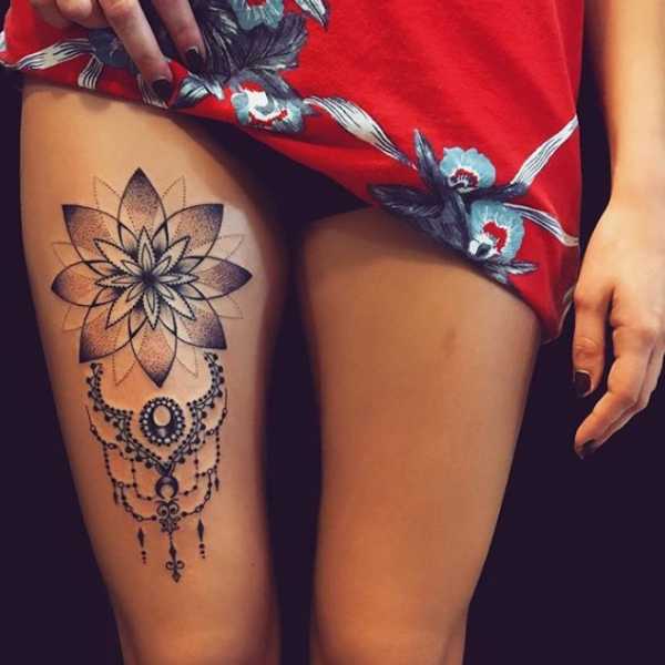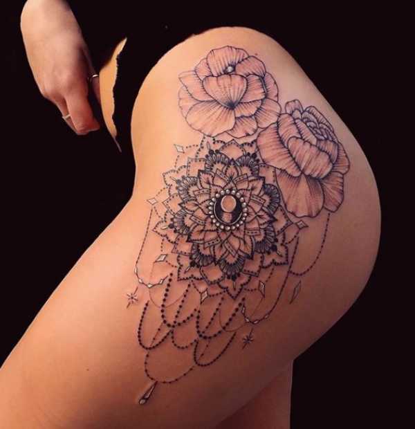 - Бедра. Рассматривая модные в 2019 году тату для девушек, невозможно пройти мимо фото с рисунками на бедре. Пожалуй, на сегодняшний день это самое излюбленное у барышень место, которое можно украсить. Так же, как утверждают некоторые опытные мастера, правильно подобранная тату может даже скорректировать фигуру, сделая ваши бедра визуально меньше. А особой любовью здесь пользуются объемные переплетающиеся цветочные узоры.
