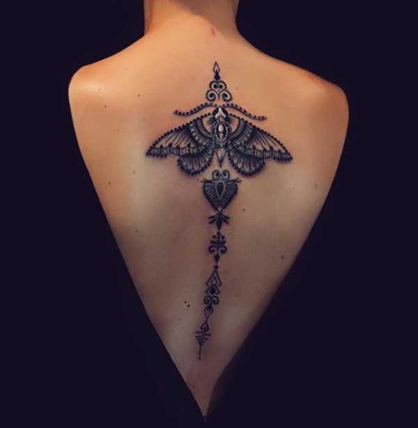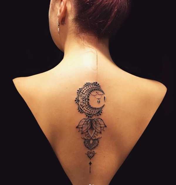 - На спине. Конечно, татуировку на спине по статистике чаще всего рисуют именно мужчины. Однако некоторые особо продвинутые модницы тоже не отказывают себе в удовольствии разместить вдоль позвоночника какой-нибудь масштабный рисунок. Например, это могут быть крылья, или что-то столь же грандиозное. И опять здесь следует заметить, что наносить тату на кожу в области позвоночника может быть болезненным. Имейте это ввиду, создавая эскиз.
