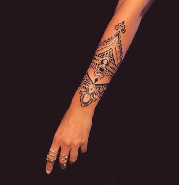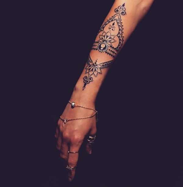 В настоящее время этот узор является одним из самых модных среди татуировок для девушек, которые изображаются на руке. Считается, что в этом случае его обладательница не будет совершать необдуманных поступков, а в её жизнь придут здравый смысл и благополучие. Нередко можно встретить мандалу под грудью (об этом мы писали чуть раньше), и на пояснице.