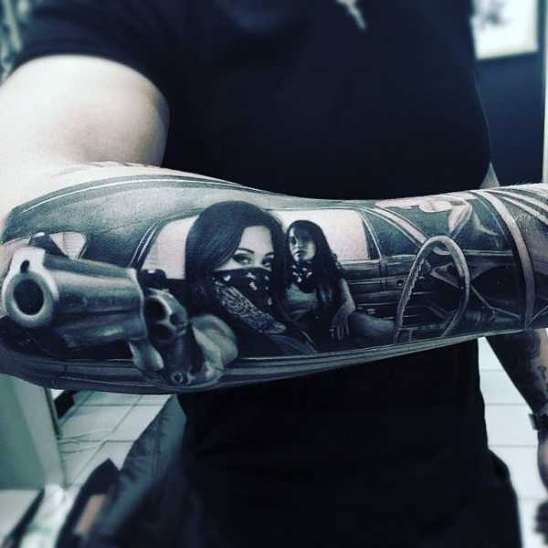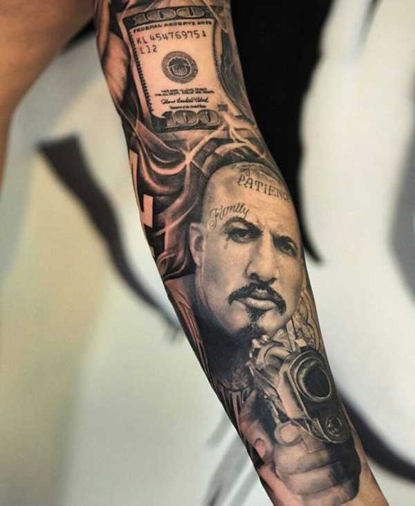 Если вы ищите брутальные татуировки для мужчин на руку, то вам отлично подойдут рисунки в стиле чикано. Это самые популярные «пацанские» тату, на которых изображаются красивые девушки, автомобили, оружие, деньги, игральные кости и прочие атрибуты. Это стиль, который изначально появился среди мексиканских заключенных, а на сегодняшний день широко распространился по всему миру.