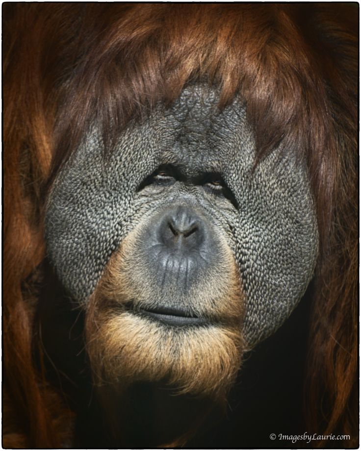 Nahaufnahme eines Sumatra-Orang-Utans auf schwarzem Hintergrund