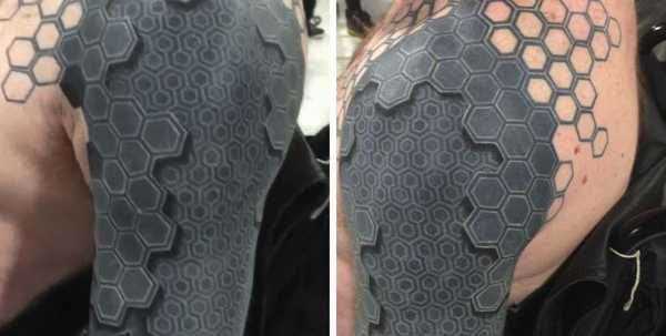 Сложная, запутанная, со множеством деталей татуировка мозаичной плоскости. Мало того, что проработка каждого элемента требует от мастера невероятной усидчивости — художник нашел в себе силы довести замысел до конца и создать несколько плоскостей со сложным сотовым узором.