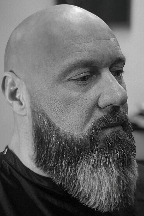Вы можете предположить, что лучший способ смягчить вид полностью лысой головы — сделать бороду очень угловатой.