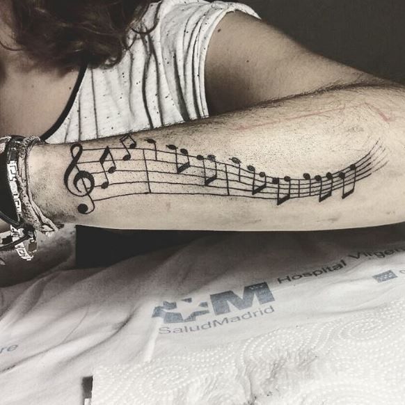 Он прекрасно изображает синонимию гитары с музыкой. Эта татуировка, состоящая из высоких, басовых и дрожащих музыкальных нот, отражает сущность музыкального инструмента, столь же мелодичного, как гитара.