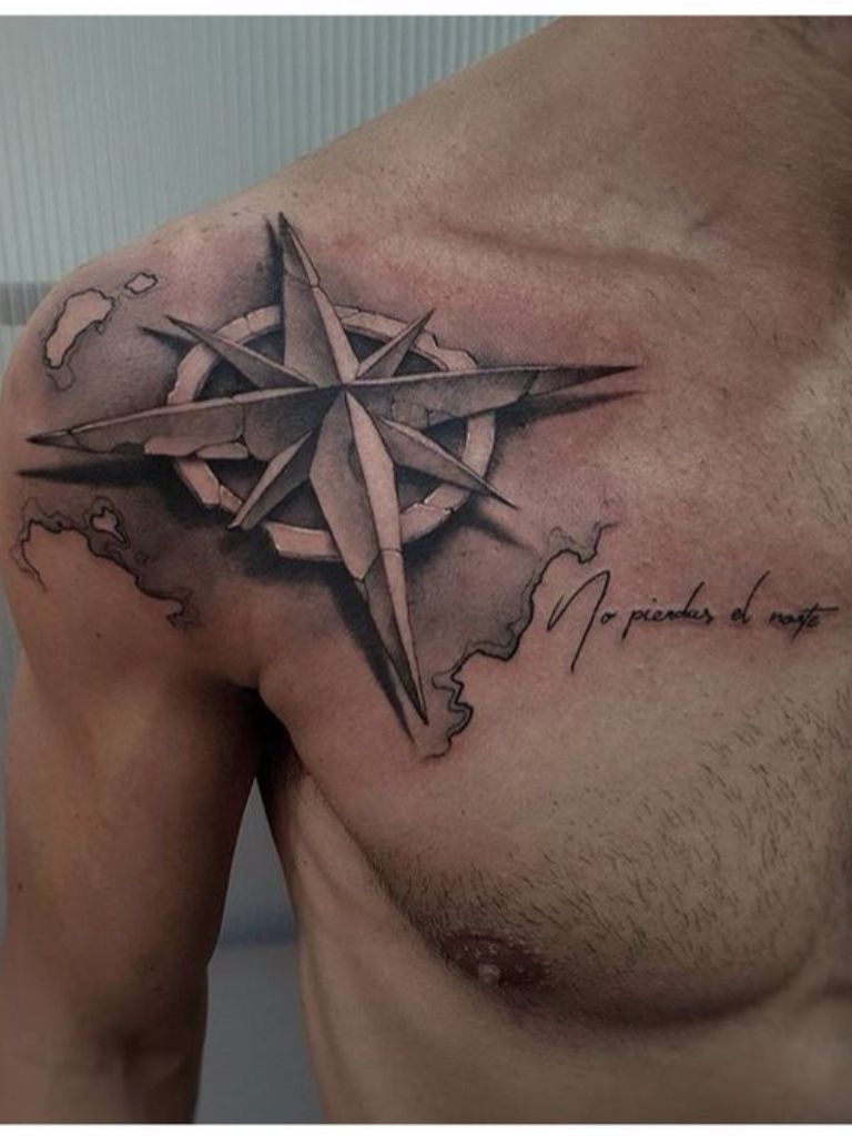 Если вы мужчина и обладаете развитым телосложением, грудь может стать идеальным местом для нанесения тату, поскольку, одним из ее важных значений заключается в том, что она представляет собой курс, которому мы следуем в нашей повседневной жизни и Роза ветров помогает нам не сбиться с этого пути.