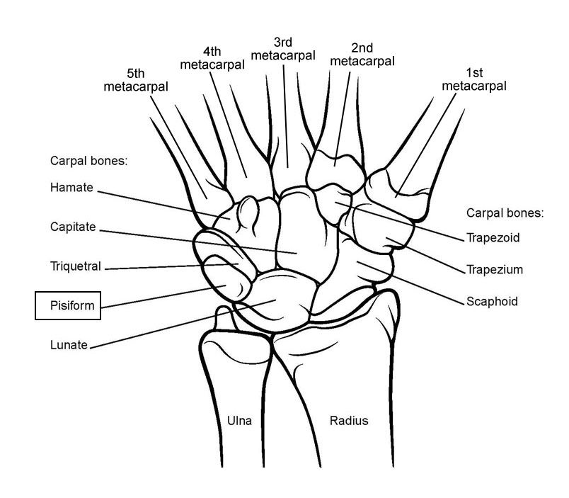 Локтевая кость является большей из двух костей предплечья, хотя она сужается на конце запястья, чтобы стать уже, чем лучевая кость в этой точке. Радиус располагается на стороне большого пальца запястья, а локтевая кость — на стороне мизинца. Они образуют лучезапястный сустав с костями запястья. Всего насчитывается 8 костей запястья, расположенных в два ряда, проксимальный и дистальный.