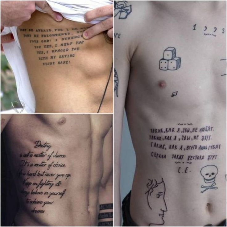 Особенно актуально, если нательное изображение имеет глубокое значение, понятное только своему обладателю. - Возможность выбирать разные размеры тату. Несмотря на то, что ребра дают возможность мужчине создать полноценную нательную композицию большого масштаба, часто татуировки здесь делают миниатюрными.