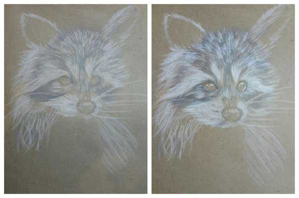 - Сверху нужно добавить следующий слой чёрного карандаша и по нему проходимся белым. Поставьте белым цветом блики на глазки. Возвращаемся к чёрному цвету, заполняем пространство на глазках и носике. Делаем темнее участок шерсти на ушках, выделяем полосы около глаз. Делаем их насыщеннее.