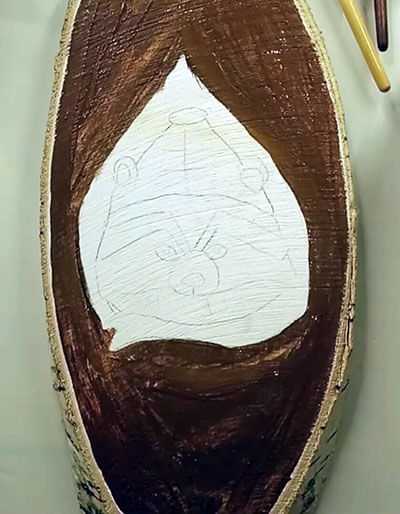 С помощью добавления охры и черной краски в коричневый цвет, получаем различные оттенки и стараемся показать рельеф коры. Наносим эти цвета огибающими линиями, создавая текстуру дерева. Нанести можно несколько слоев, пока вы не добьетесь желаемого результата.