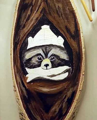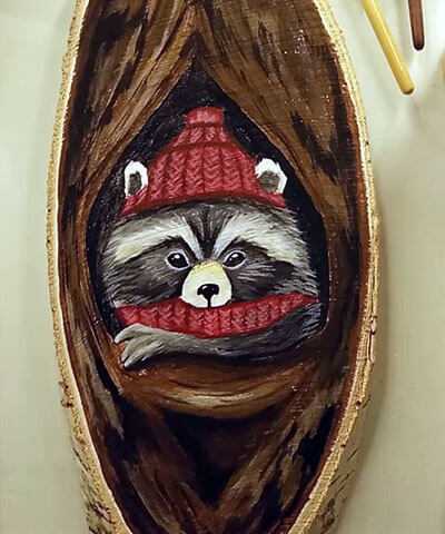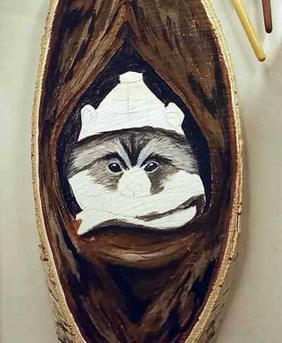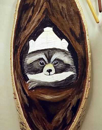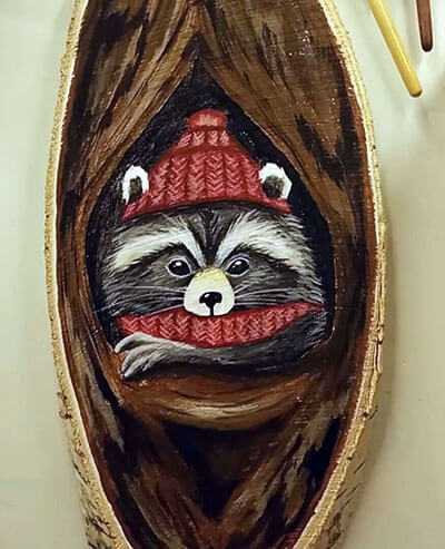 Сегодня я предлагаю нарисовать милого пушистого енота на срезе дерева. Рисовать можно как гуашью, так и акрилом.