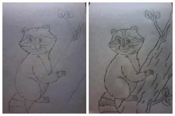 - Наш енот будет сидеть на дереве. В некоторых местах прорисовываем веточки и листья. На листках и стволе нужно изобразить тонкие полоски.
