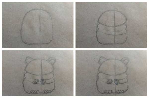 Снизу и сверху делаем слегка приплюснутым. Через фигуру нужно провести вертикальную ось, но так, чтобы она была слегка смещена вправо. Это может придать положению тела нужный вид. - Начинаем придавать телу нужную форму. Выводим по сторонам изгибы, как это показано на образце. Сверху чертим овал, который станет головой. Примерно в центре общего наброска прорисуем штрихи, которые помогут вывести лапки.