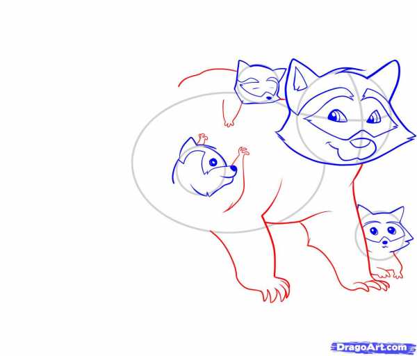 В этих шагах мы займемся их телами. Для мамы енотов дорисуйте задние и передние лапы и так же поступите с мелкими енотами, это ток который на спине, за передней лапой и перед нами возле второй лапы.