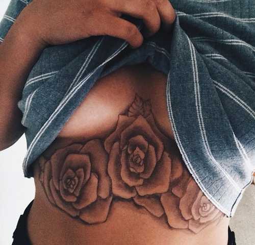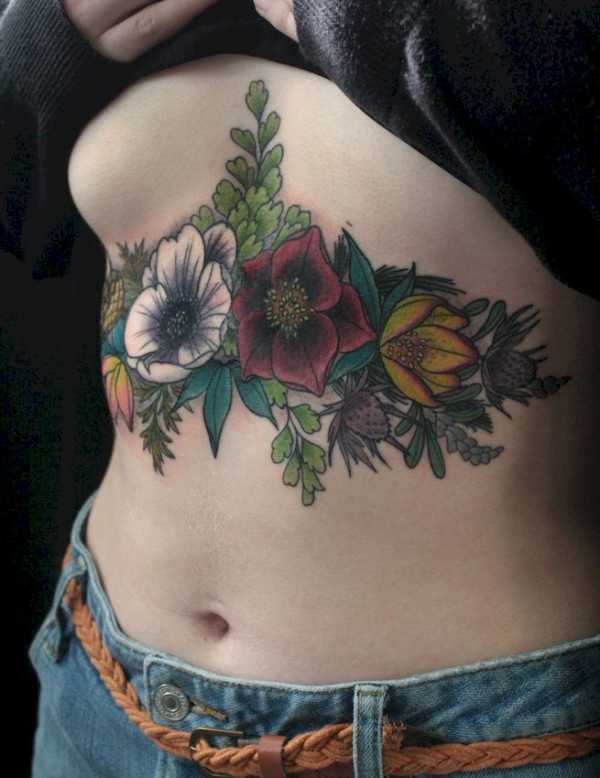 Для тату с изображением цветов подходящим вариантом для нанесения является зона под грудью. Такая татуировка получается очень красивой. А вот будет она нежной или вызывающе яркой, зависит только от вашего желания. Цветочный рисунок замечательно выглядит как в однотонном исполнении, так и в цветных вариациях. Хотите получить скромное тату, выберите одиночный небольшой цветок и расположите его сбоку под грудью. Также прекрасно сморится одиночная роза. Более яркая, но в то же время, не менее нежная получится татуировка, выполненная в цвете в виде нескольких бутонов. Но при этом надо выбирать неяркие тона. Большая татуировка в виде цветов привлечет внимание окружающих в пляжный сезон.