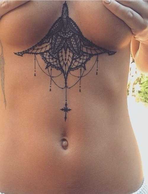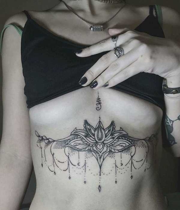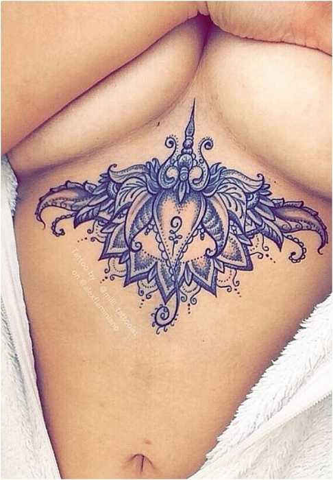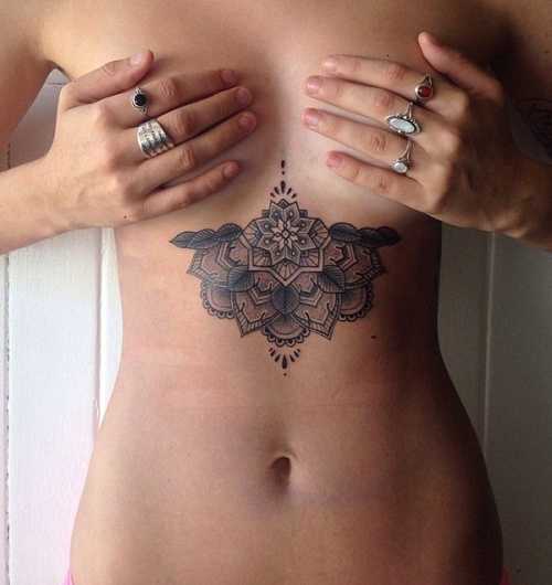 Татуировкой на теле молодой девушки уже никого не удивишь. Представительницы прекрасного пола месяцами ждут очередей к тату мастерам, чтобы набить себе желанный рисунок на теле. Не так давно, среди девушек появилась тенденция набивать тату под грудью. Рисунок в таком месте смотрится очень сексуально и его не видно под одеждой. Девушки тщательно подбирают себе эскизы, будь то надпись, маленькая татуировка или масштабный рисунок. Тату на груди для девушек это яркий аксессуар который помогает чувствовать себя уверенно и смело. Чаще всего в этом месте хотят изобразить индийские орнаменты (мандалы) либо цветочные узоры.