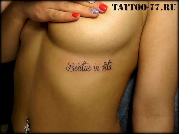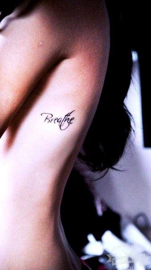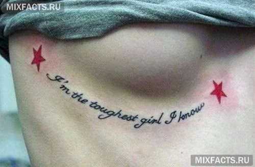 Татуировка надписи под грудью обычно набивается сбоку, но возможны различные вариации. Для эскиза служат девизы по жизни, памятные события, выраженные в простой фразе или цитаты из любимых книг, кинофильмов. Язык надписи выбирается по своему желанию. Распространены строчки на английском, французском или арабском языках. Перед сеансом настоятельно советуем несколько раз проверить перевод фразы у проверенных источников.