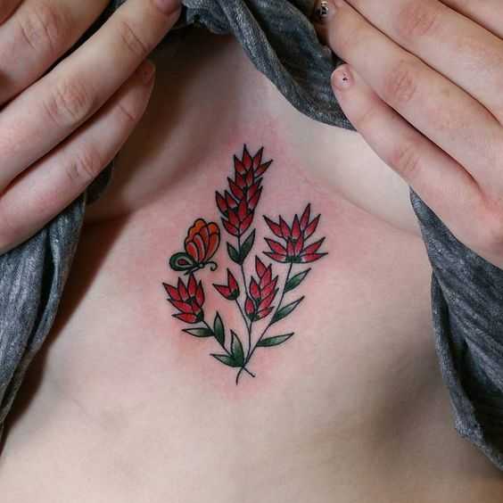 Многие представительницы слабого пола выбирают для татуировки под грудью изображение, которое размещают чуть в стороне. Самая популярная – ветки растений. Наносят изображение флористики от центра под грудью. Выполнив такую татуировку в цвете – получите оригинальный и яркий рисунок. Красиво и привлекательно выглядит татуировка в виде летящей.