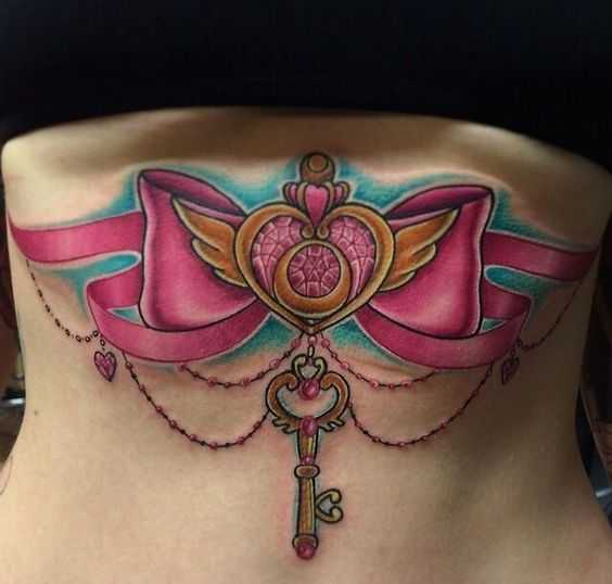 Женщины, увлекающиеся мистикой и эзотерикой часто наносят на тело разнообразные сакральные символы, изображения животных с подходящими чертами характера (змея, тигр, лев, скорпион), картинки-талисманы. Близость узора к области сердца также позволяет использовать защитные обереги, стало популярно забивать зону под грудью изображениями ангелов, православных и католических крестов.