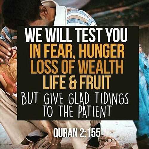 “Мы непременно испытаем вас незначительным страхом, голодом, потерей имущества, людей и плодов. Обрадуй же терпеливых,” Сура 2, аят 155