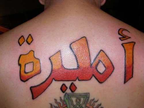 Не все арабские тату должны быть нарисованы в строгом порядке. Большое и цветное, размещенное далее в статье тату с арабского переводится как “принцесса”. Оно содержит крест в кельтском стиле и солнце позади. Две разные культуры и стиля сплетаются, образуя очень красивый рисунок. Скрипт завершен ярко-оранжевым и желтым цветом, символизирующими солнце.