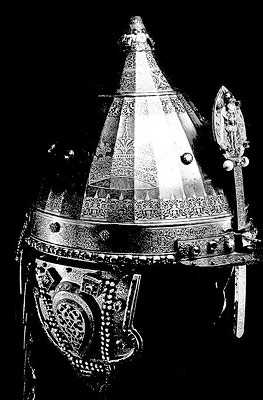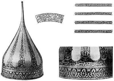 Рис. 5.15. Шлем Ивана Грозного. XVI век. Королевский музей в Стокгольме. По ободу шлема идет широкая арабская надпись, а под ней более мелкими буквами, — русская. Взято из [49], т. 1, с. 131.