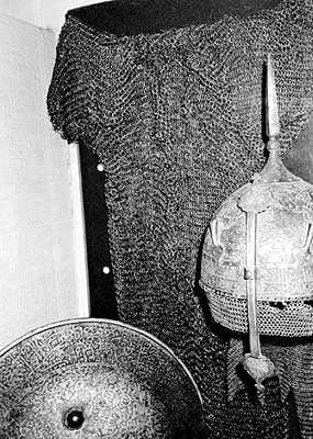 Рис. 5.11. Русское вооружение: кольчуга, шлем, щит. Шлем и щит густо покрыты АРАБСКИМИ НАДПИСЯМИ. Музей Александровской Слободы.