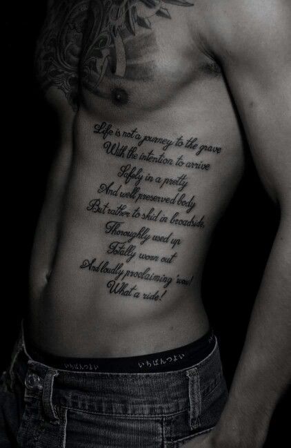 Сторона ребер Это не для брезгливых, так как делать татуировку сбоку ребер болезненно и неудобно. Однако, когда дело доходит до написания большой цитаты, состоящей из многих слов, крупным и/или широким шрифтом, с эстетической точки зрения это не становится намного лучше. Кроме того, татуировка с цитатой по своей сути менее болезненна, чем другие рисунки, поскольку текст обычно наносится тонкими линиями, где приложенное давление менее интенсивно.