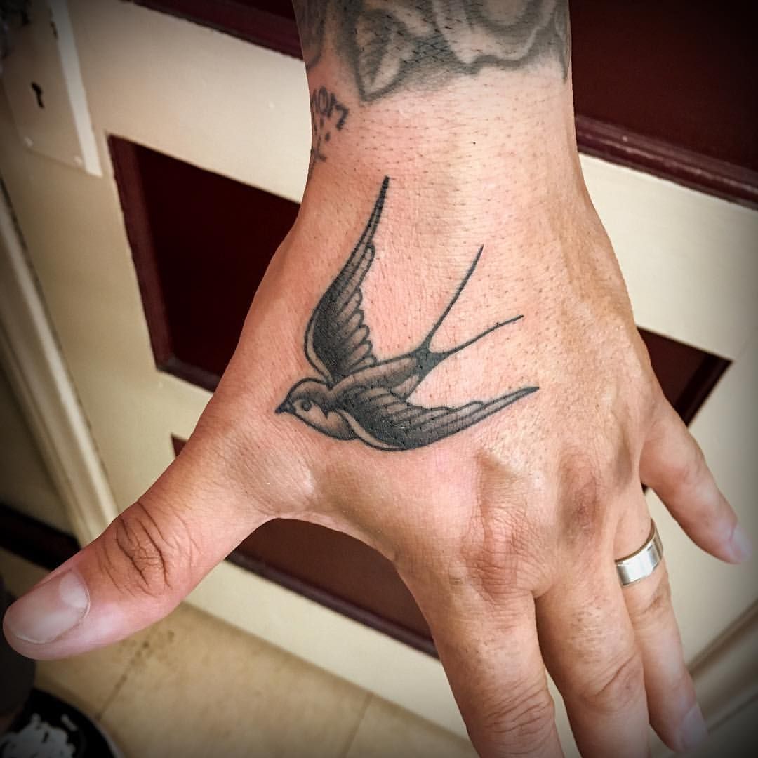 Красивая татуировка в виде ласточки сделана на руке, где она хорошо видна.