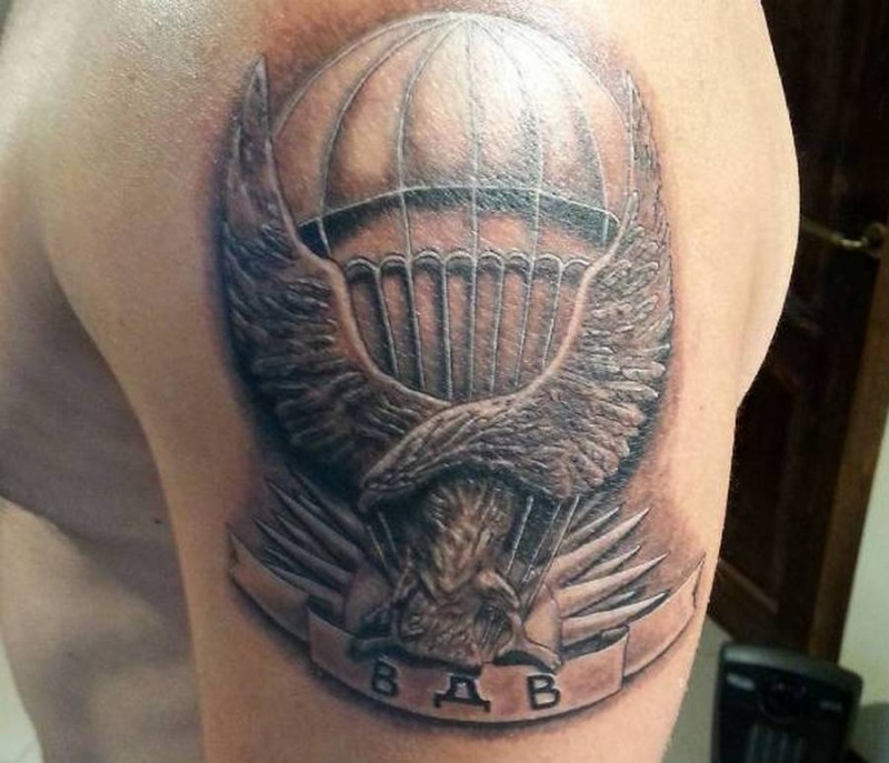 Среди солдат ВДВ самой популярной является наколка, изображающая открытый парашют с крыльями БМД. Нередко на такой тату указаны годы службы и место, в котором они проходили. Довольно часто у бойцов данного подразделения можно повстречать нательные изображения крылатого меча с беретом на щите и эмблемой ВДВ, крылатого волка. Отдельного внимания заслуживает нелегкая в исполнении, но, безусловно, красивая татуировка парашютиста с раскрывающимся парашютом на фоне улетающего самолета.