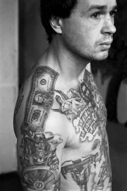 К носителям большого количества татуировок относятся как к дурачкам. Во времена СССР, к примеру, воровские звезды бились на ключицах (это означало «Никогда не надену погон») и на коленях («Никогда не встану на колени перед ментами»). Это были сугубо идейные, воровские наколки. Если такие звезды бил человек, к воровскому миру не относившийся, — за это можно было ответить по понятиям. Потом, ближе к 90-м годам, знаменитые наколки стали бить многие люди, не имеющие никакого отношения к ворам, и звезды стали менее статусными татуировками. Сегодня существует тюремное понятие «За наколку нет ответа». Оно означает, что если кто-то по глупости набил себе татуировку с серьезным смыслом — трогать его не надо, что с дурака возьмешь. Хотя, конечно, иногда отвечать за свои действия таким людям приходится», — говорит эксперт.