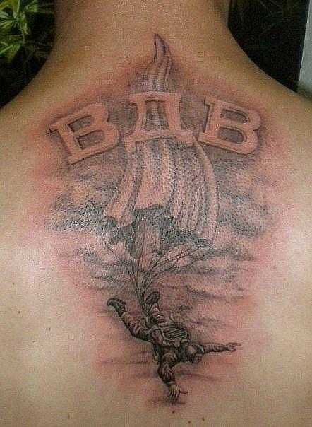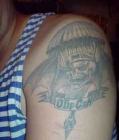 Здесь все просто, наколка делается на левом плече, на ней изображается парашют с крыльями бмдэшку, дополнительно указывается населенный пункт, под которым проходила служба. Иногда среди рисунок встречается крылатый меч с беретом на щите, а на втором плече эмблема ВДВ и еще крылатый волк, где написано «45 ОРП». Самым оригинальным рисунком является парашютист с раскрывающимся парашютом, а на фоне улетающий самолет. Стоит отметить, что среди бойцов ВДВ практически 100% по окончанию службы наносят татуировки.