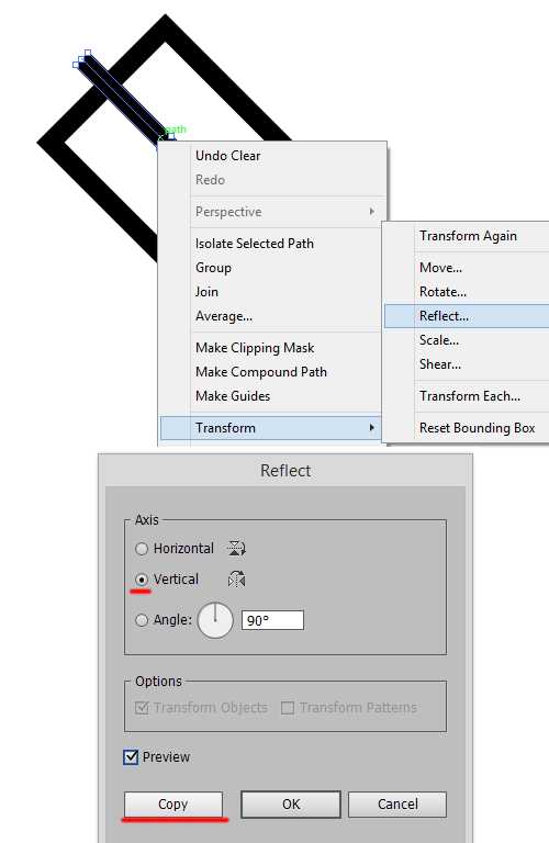 Когда линия готова и стоит на нужном месте – её надо отразить. Выделите линию, сделайте правый клик, в контекстном меню выберите Transform > Reflect. Появится окно с опциями отражения. Нужно выбрать Vertical и нажать кнопочку Copy.