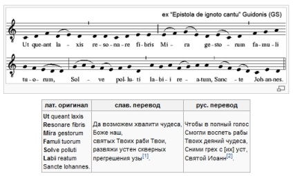 Запись нот слогами берет свое начало в средневековой Италии. Первым, кто начал записывать так ноты, был монах-музыкант Гвидо, который обучал мальчиков церковному пению. Занятия с хором проводились ежедневно, в качестве распевки Гвидо использовал гимн Святому Иоанну — покровителю пения. Именно эта песня и стала основой первой нотной записи. Как это произошло? Можно сказать, что абсолютно случайно.