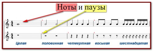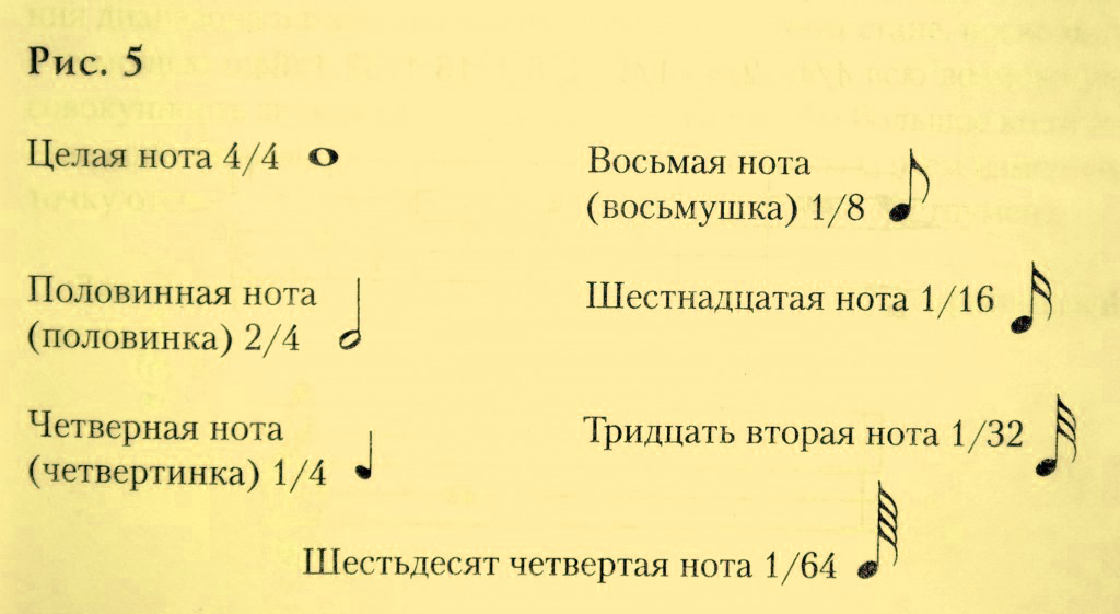 Продолжительность каждой ноты относится к области музыкального времени, которое представляет собой непрерывное движение с одной и той же скоростью равных долей, сравнимых с мерным биением пульса. Обычно одна такая доля ассоциируется с четвертной по длительности нотой. Посмотрите на рисунок, вы увидите графическое изображение разных по длительности нот и их названия: