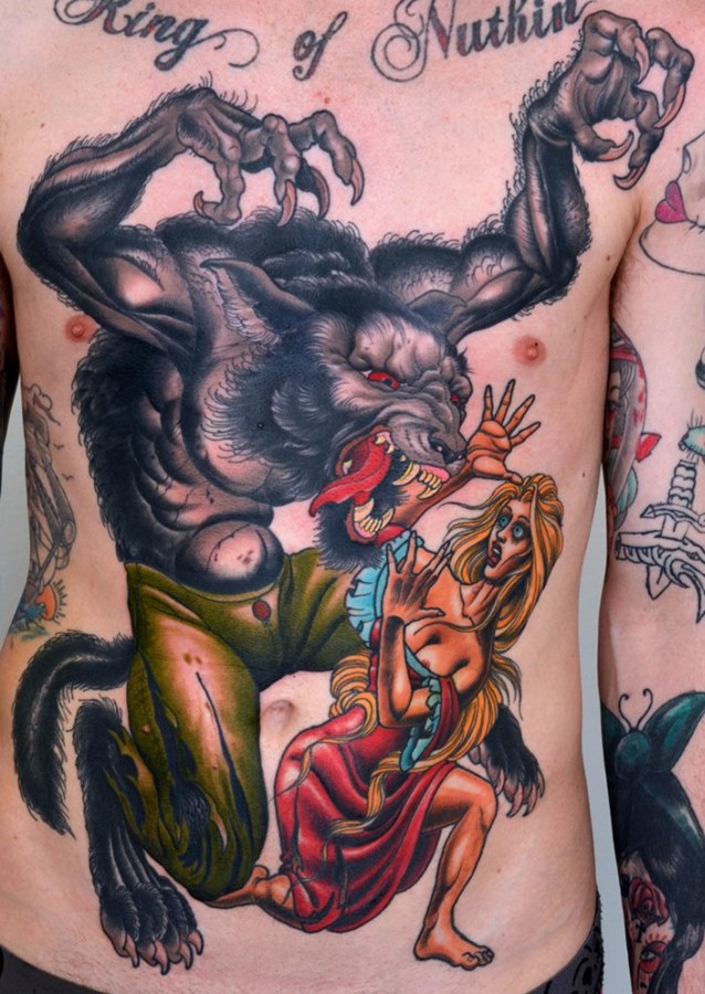Скелет и оборотень Криса Томпсона в 522 Tattoo. Темная голова оборотня с красной луной Алекса Вердера в Good Fortune Tattoo. Сердитый оборотень, крадущий женщину, Хилари Фишер Уайт в Бруклине. Черный оборотень с полумесяцем и костями, сделанный Джеймсом Армстронг в Holy Mountain Tattoo. Большая и смелая неотрадиционная голова оборотня, сделанная Яном Вельдманом в Gypsy Cat Tattoos в Виннипеге. Часть трансформации Midway Джонатана Пенчоффа. Свирепая и реалистично выглядящая голова оборотня Джордана Бейкера в Penny Black Tattoo.
