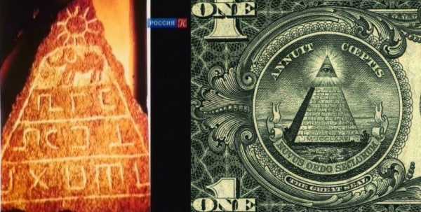 Справа я поместил известный современный символ, нанесённый на однодолларовую купюру, о котором я тут же вспомнил, увидев столь уникальную археологическую находку.