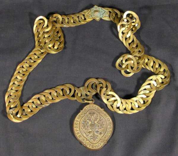 “В Российской Империи официальные лица, осуществлявшие в разные времена судебные функции, вершили правосудие не в мантиях, а в привычной одежде своего сословия. Не был предусмотрен для них символический гардероб и в ходе судебной реформы 1864 года. Но зато в Законе “Учреждение судебных установлений” от 20 ноября 1864 года говорилось, что должности мирового судьи присваиваются “особый знак его звания и особая печать”. Форма знака для представителей наиболее многочисленного судейского корпуса была утверждена 31 декабря 1865 года. Нормативные документы, устанавливающие описание знака, утрачены, но его оригинал хранится в Эрмитаже, есть он и в частных коллекциях”.