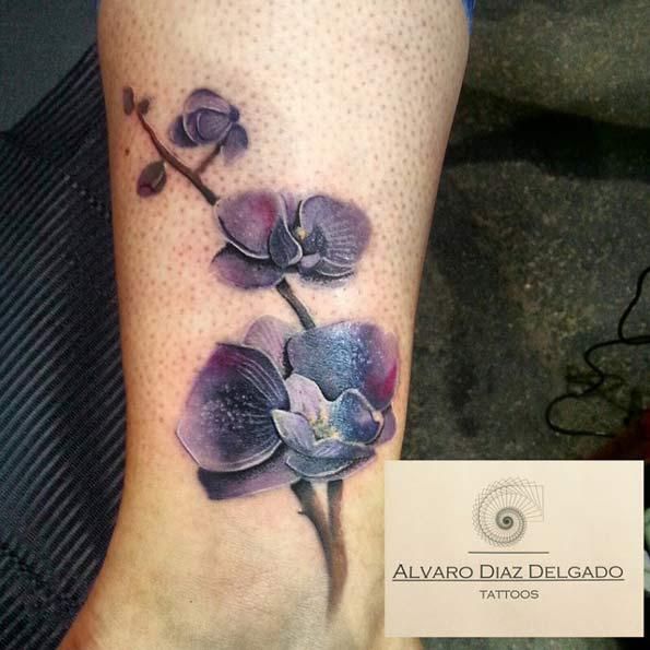 10. Фиолетовая татуировка на ноге в виде орхидеи