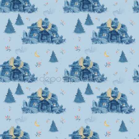 Бесшовный фон с акварелью скандинавских элементов. Волк, собака, хаски, пастух, собачью, лайка, лесной дом, лесные ягоды, филиалов, Полумесяца, олень, национальныru.depositphotos.com