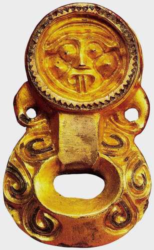 Если приглядеться к этому украшению конской сбруи, то можно разглядеть в верхней его части свернувшееся клубком животное, а в нижней – двух животных, обращенных друг к другу.