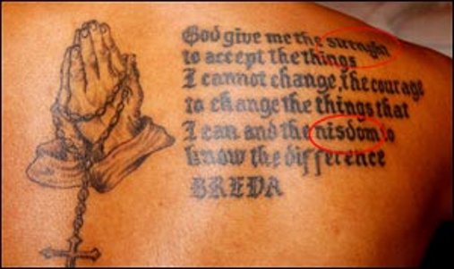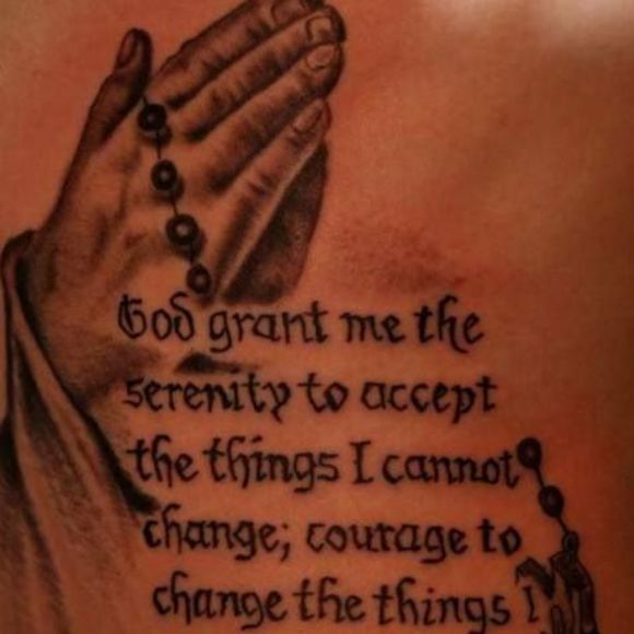 У меня на спине, под лопаткой есть небольшая татуировка со строчкой из Библии. Несмотря на то, что я знаю об отношении духовенства к рисункам на теле, я это сделала. Меня не волнует их мнение, мне важно мое ощущение единения с Богом. Кроме того, именно эта молитва заставила меня о многом задуматься.