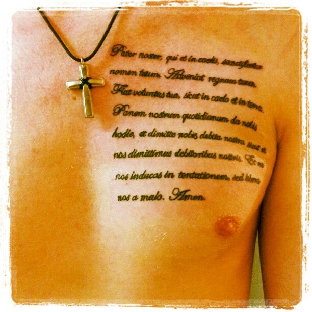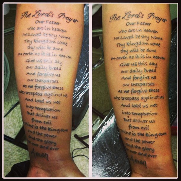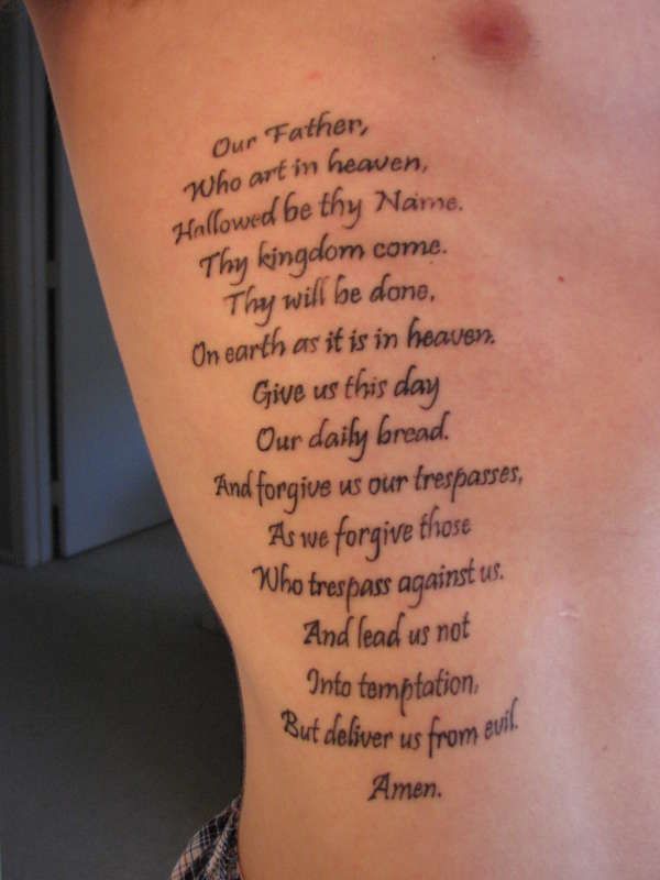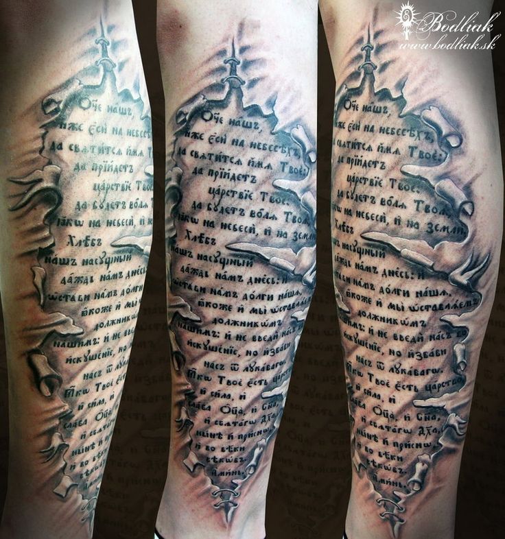 Среди текстовых вариантов самой распространенной является татуировка молитва «Отче Наш». Словоформа короткая и имеет глубокий эмоциональный потенциал. Ее часто дополняют скрещенные ладони молящегося тату дополняют четки с крестиком.
