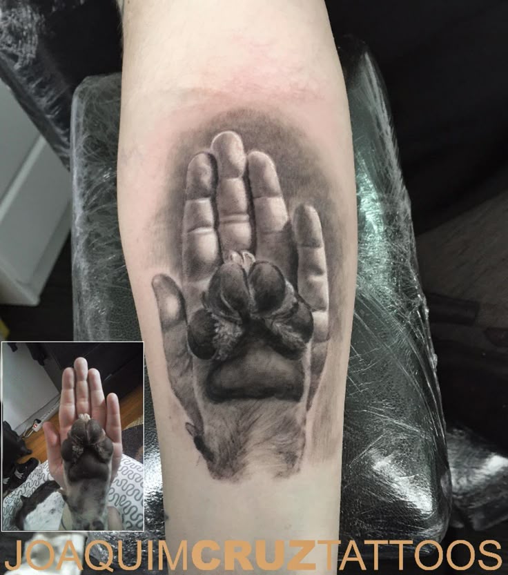 Вы можете выбрать что-то вроде этого, на котором изображены и человеческая рука, и лапа. Это означает, что не только ваш питомец всегда рядом с вами, но и вы в равной степени готовы помочь ему. Однако такая татуировка требует большего пространства.