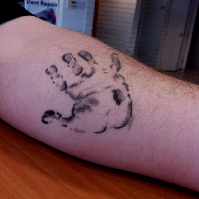 - Жирный дизайн татуировки с отпечатком лапы на руке