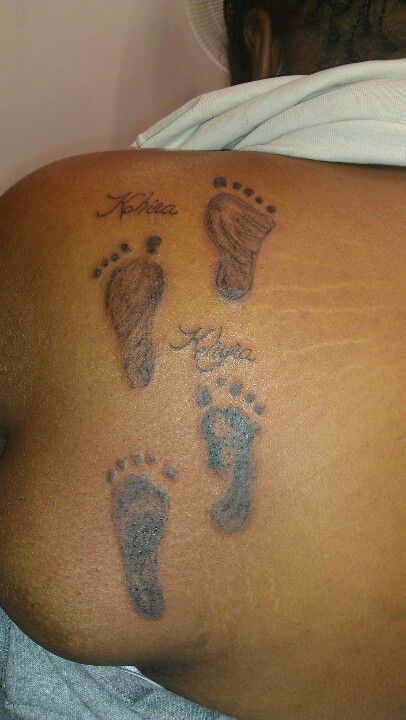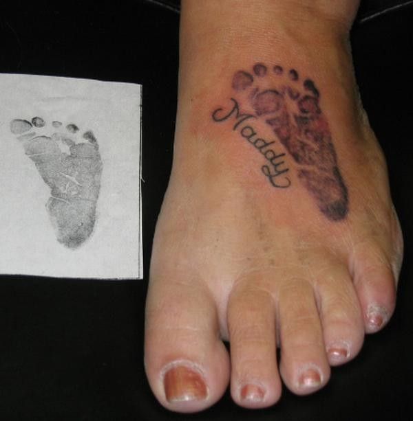Тату на ступне девушки – следы и надписьТату на ступне девушки – следы с надписью