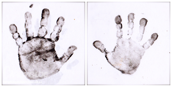 Затем используйте валик, чтобы перенести тонкий слой чернил по возможности ровно на всю поверхность ладони (b). Сделайте отпечаток (с), осторожно, но с усилием надавив ладонью на листок бумаги, следя за тем, чтобы отпечатались центр ладони, пальцы, включая большой, – хорошо, если под бумагой будет резиновый коврик. Осторожно поднимите руку, убедившись, что отпечаток не размазан (d).