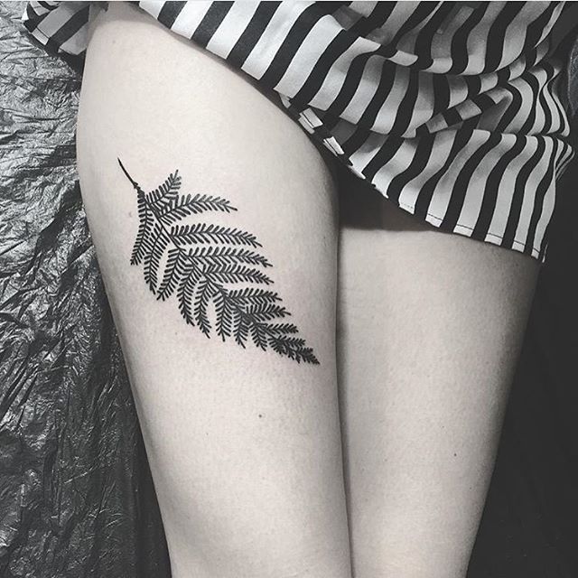 Для этого нужно хорошо определиться не только с размером, но и с формой листка. От выбранного изображения будет зависеть место нанесения. Небольшая веточка хорошо будет смотреться на шее, боку и лопатке. Татуировку цветка папоротника лучше всего поместить на бюст, плечо или же запястье руки.