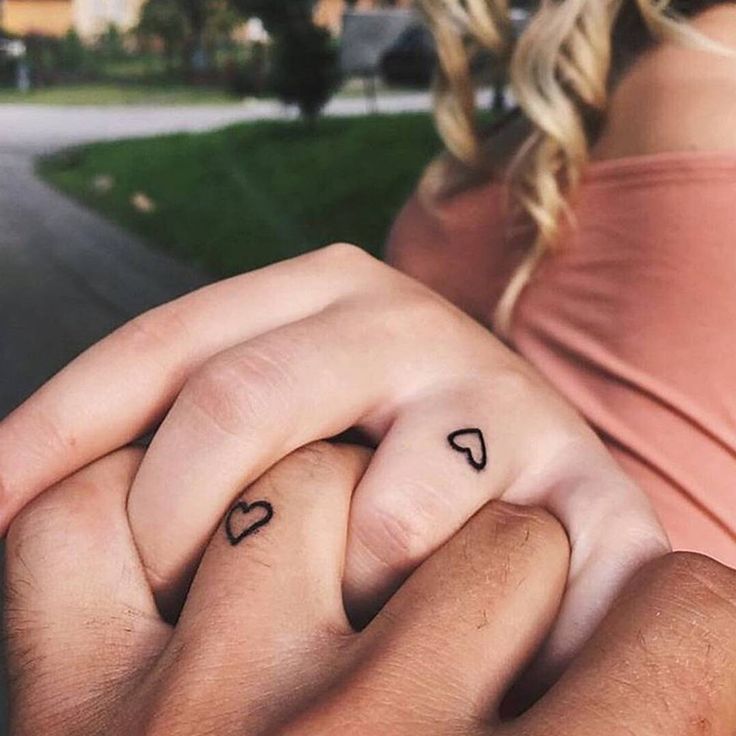 Парные татуировки для двоих влюбленных на пальцах чаще всего изображают в виде маленьких символов или рисунков. Чаще на пальцах изображают знак бесконечности, дату свадьбы или на безымянном пальце тату в виде обручального кольца.