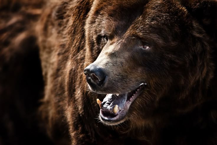 Brauner Bär brüllt hautnah auf dunklem Hintergrund